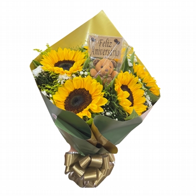 Buquê 5 girassóis e plaquinha no seu tema com ursinho de pelúcia.