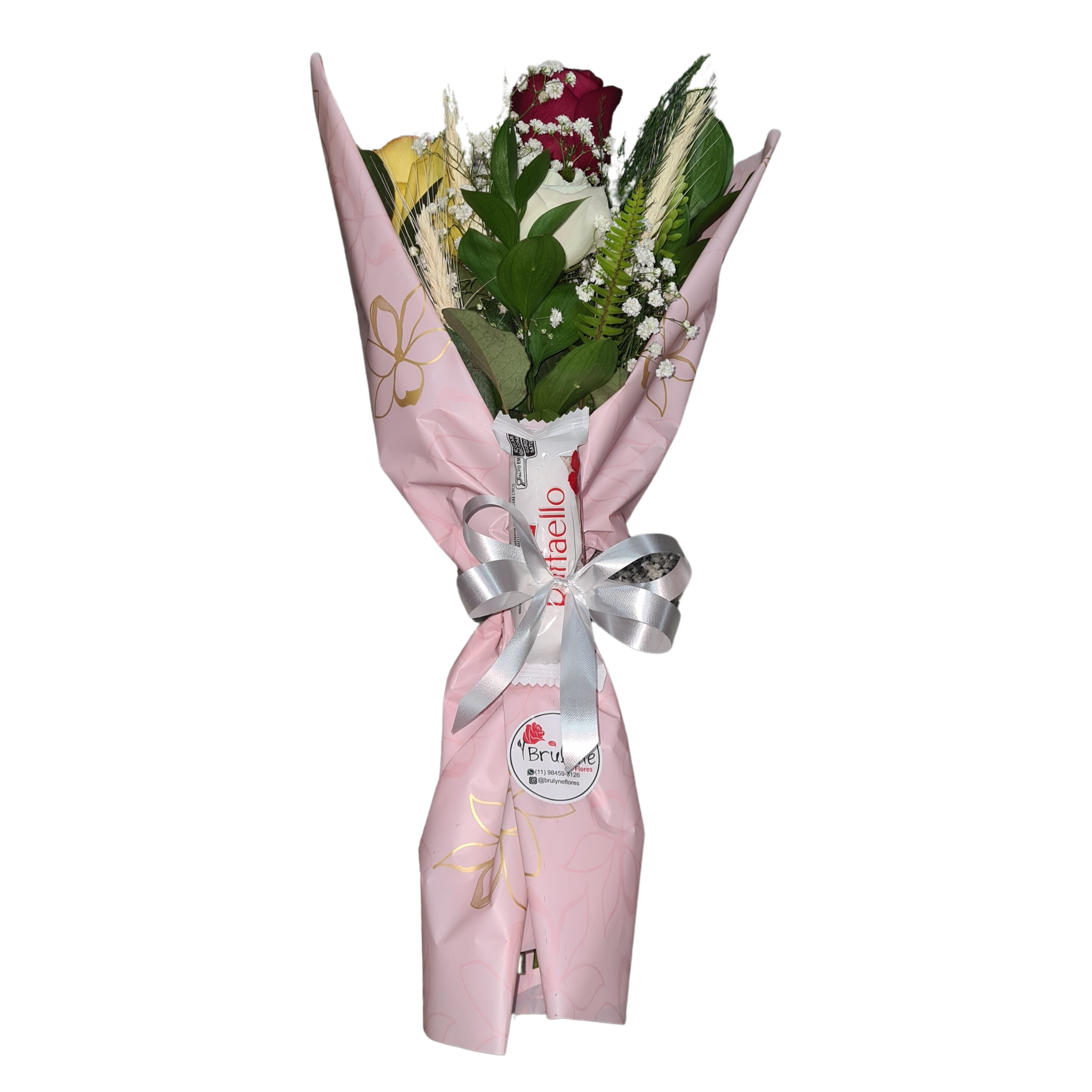 Arranjo com 3 rosas variadas + Rafaello 3 unidades