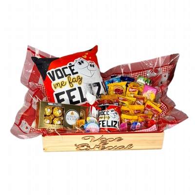 Bandeja de madeira, almofada e caneca "Você me faz feliz" e kit guloseimas e Ferrero Rocher.
