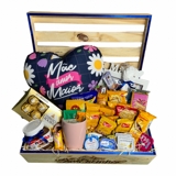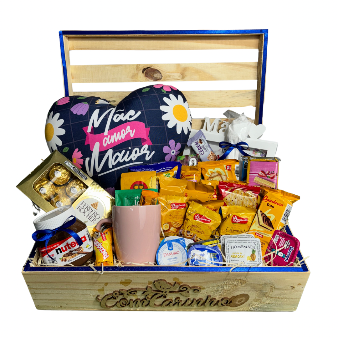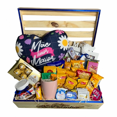 Baú de madeira, com almofada, caneca, ferrero rocher e nutella.
