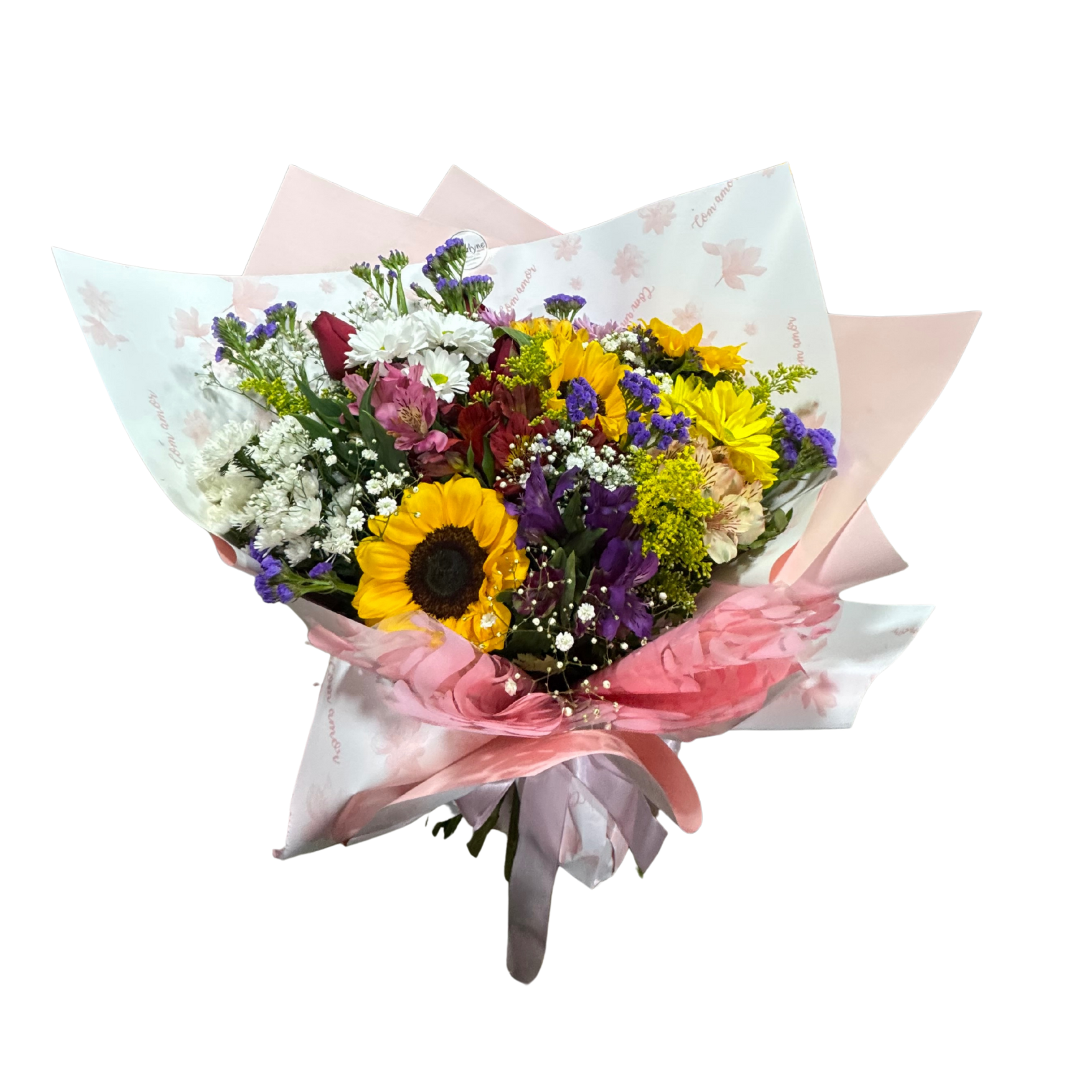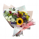 Buquê com flores variadas e embalagem moderna.