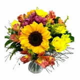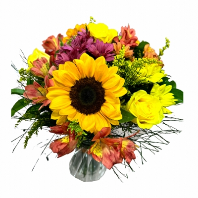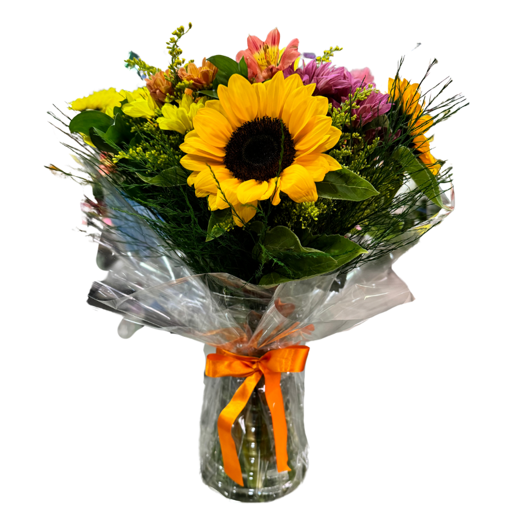 Montado com flores variadas da época em tons de amarelo e laranja no vaso de vidro.