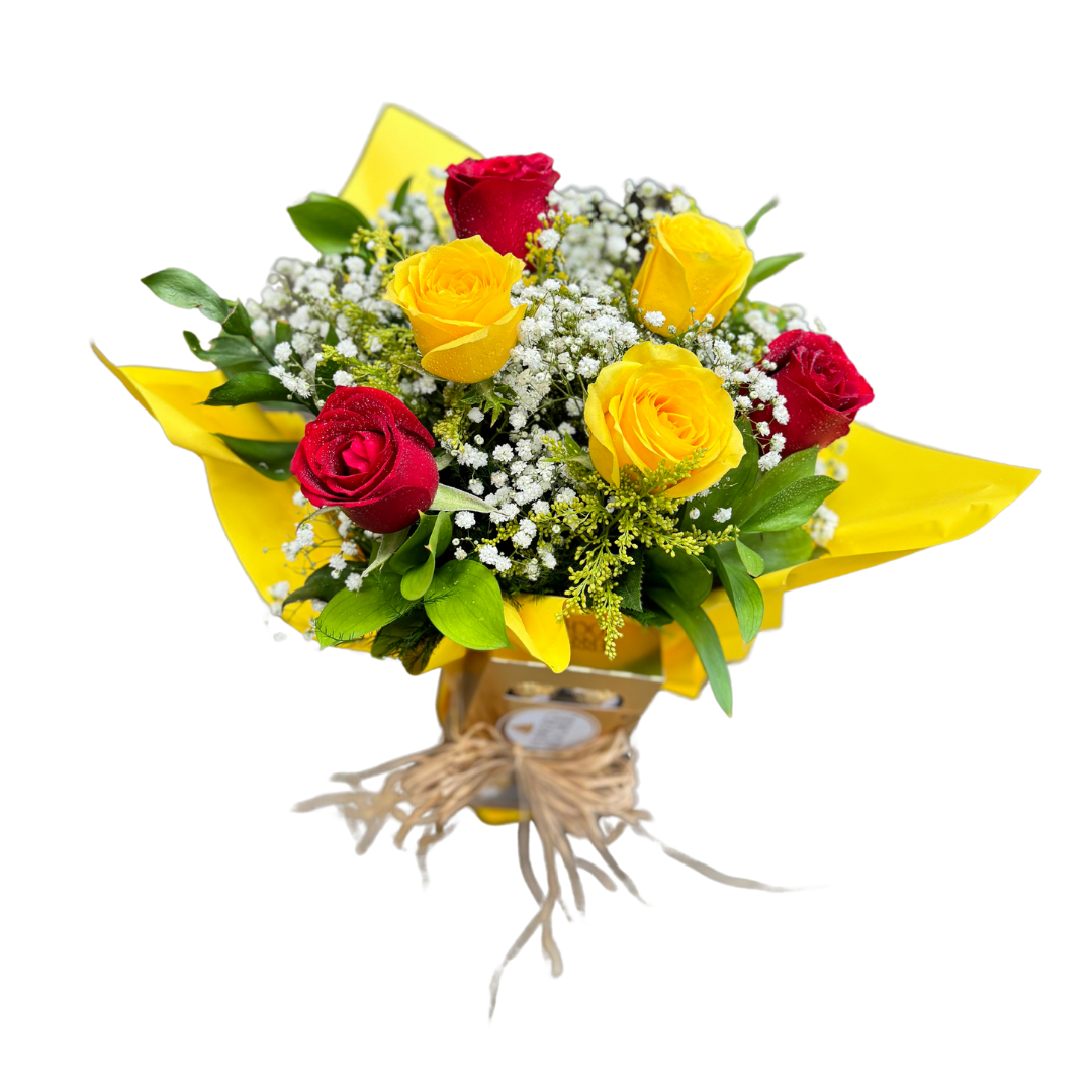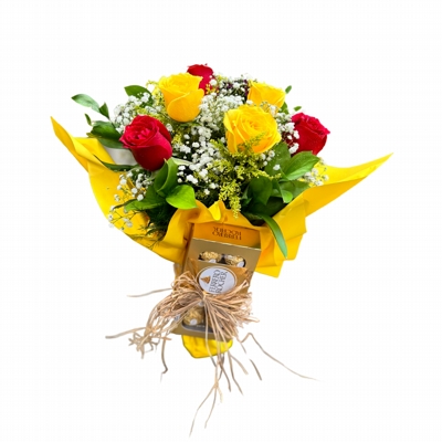 5 rosas vermelhas, 5 rosas amarelas, vaso de vidro e ferrero rocher.