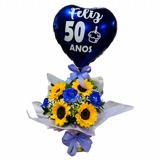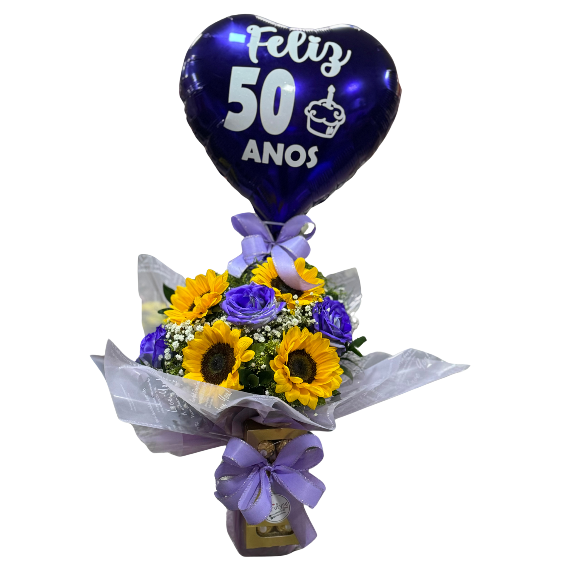 Buquê montado diretamente no vaso de vidro, com 4 girassóis e 3 rosas (brancas pintadas de roxo) acompanha caixa de ferrero rocher 8 unidades e balão liso ou personalizado.