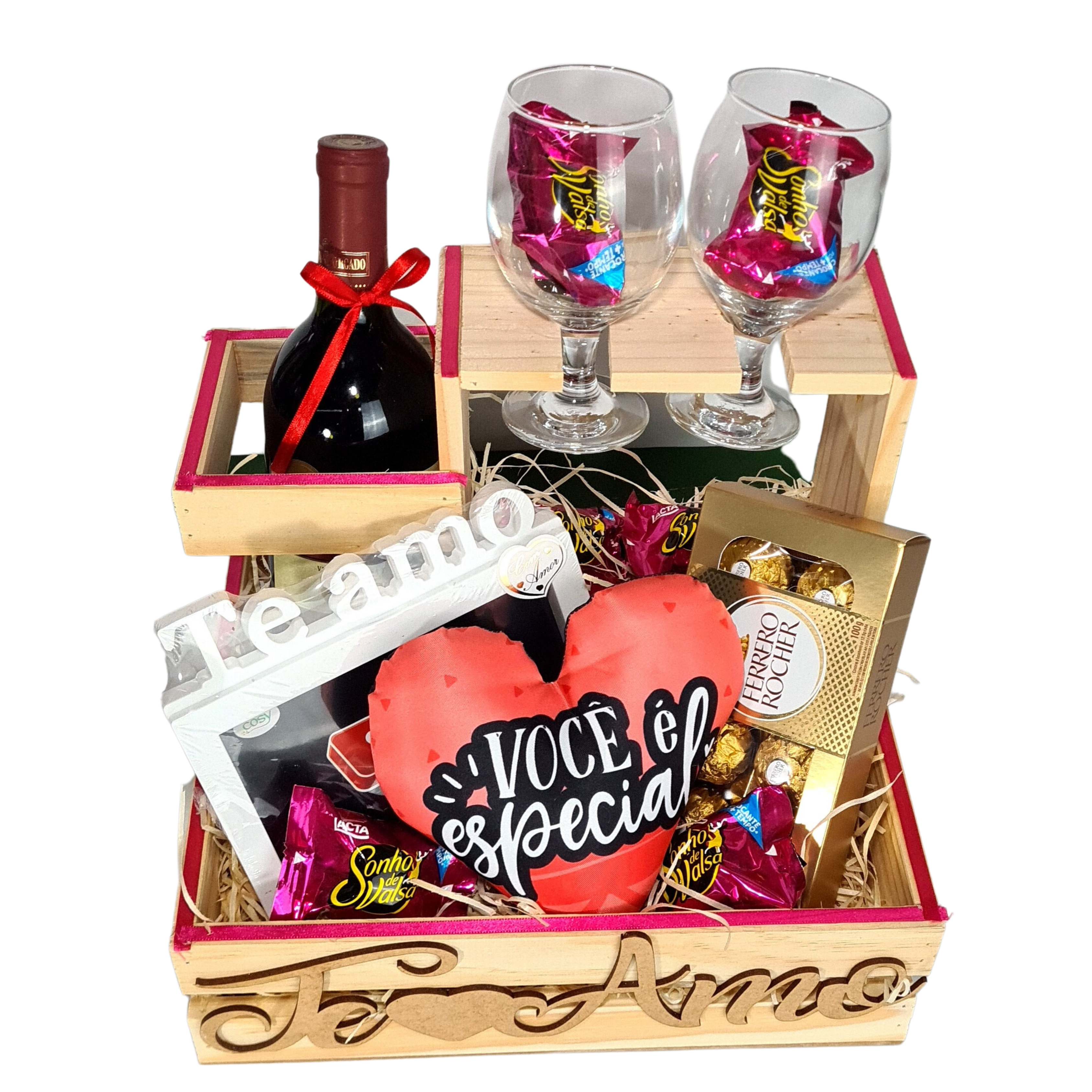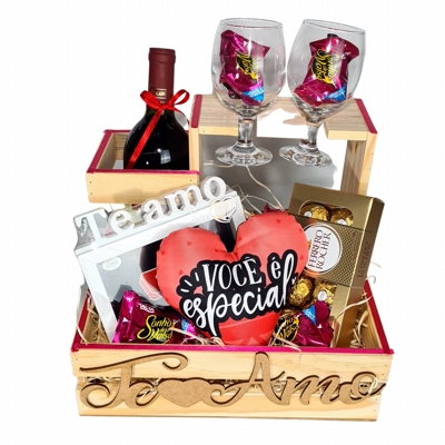 Caixa de madeira com Vinho Suave, 2 taças de vinho, Ferrero Rocher, Almofada coração "Você é especial" porta retrato e bombons.