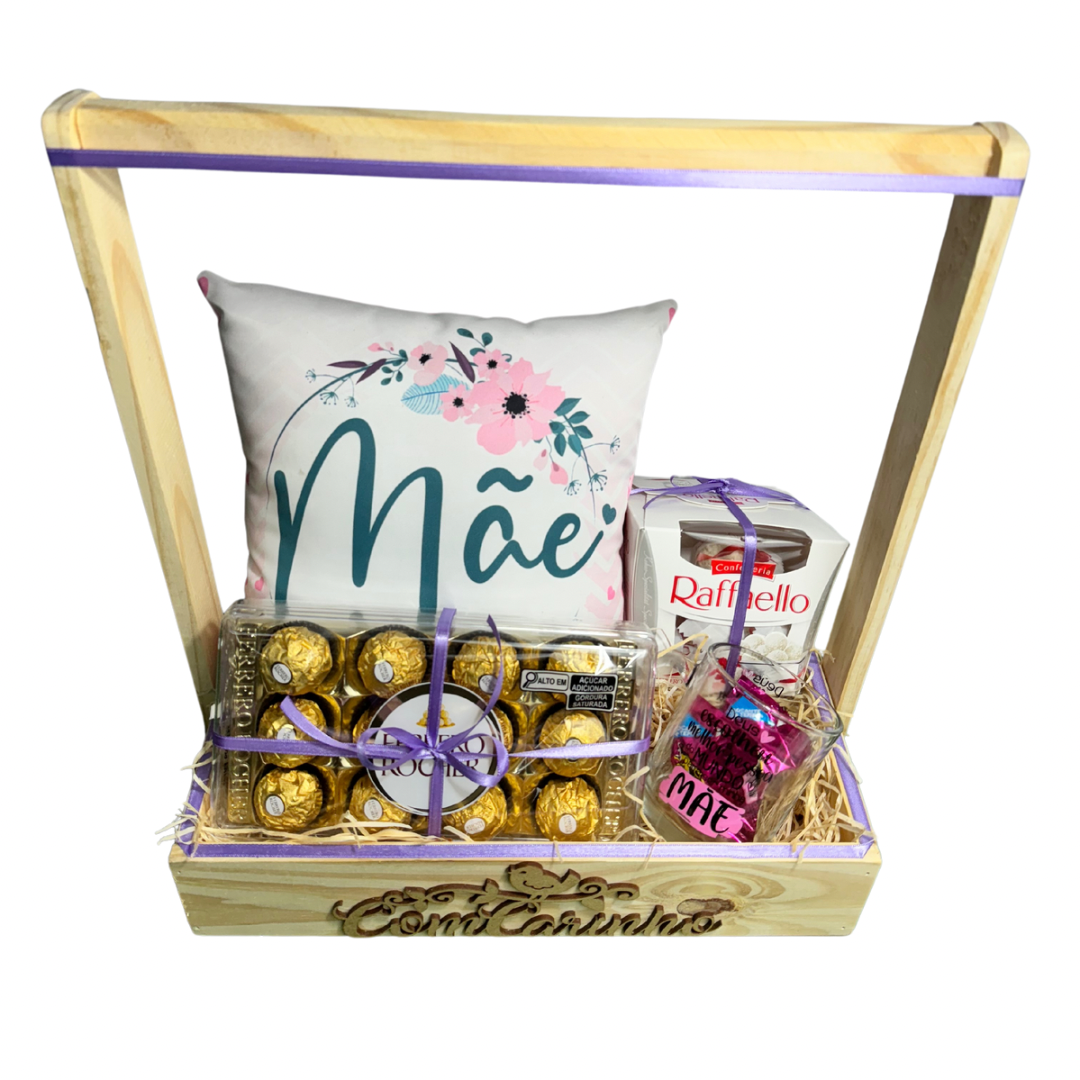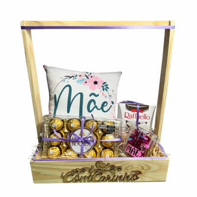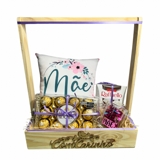 Cesta e madeira com almofada e caneca de mãe, rafaello, ferrero e sonho de valsa.