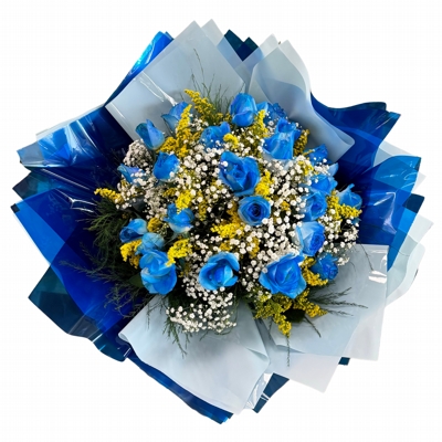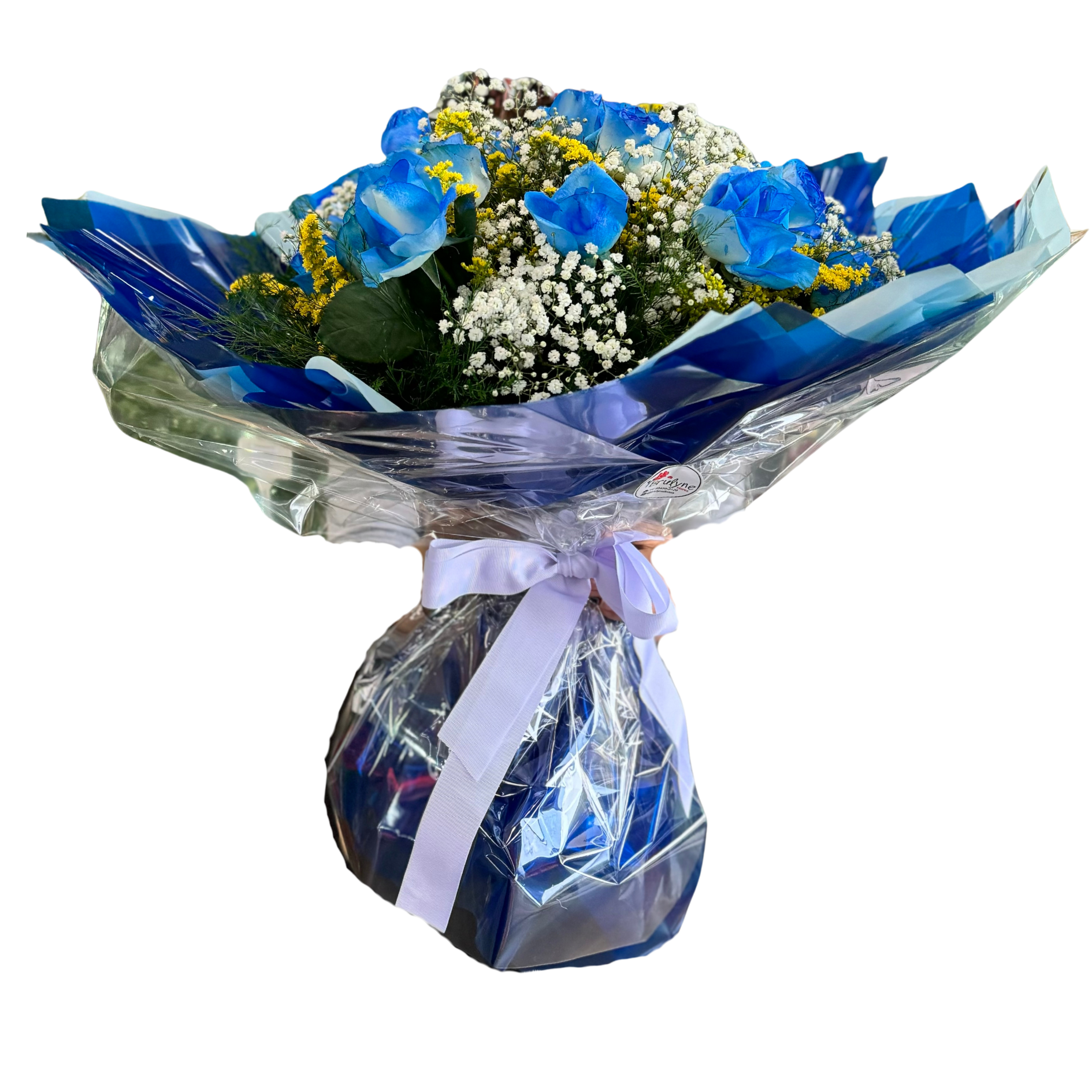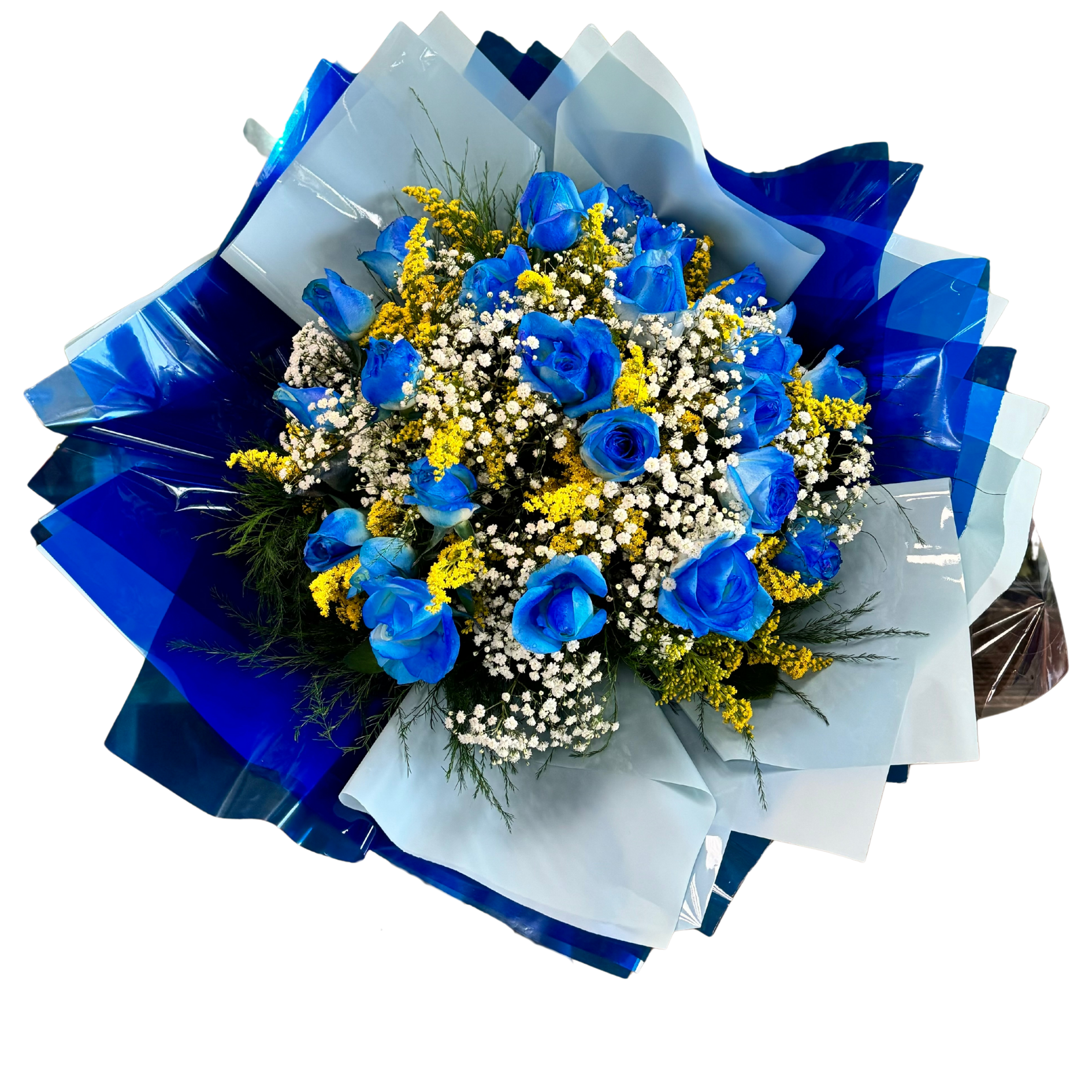 Buquê gigante montado com 24 rosas brancas pintadas de azul e embalagem moderna.