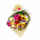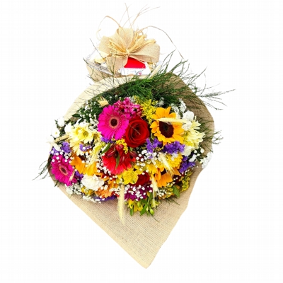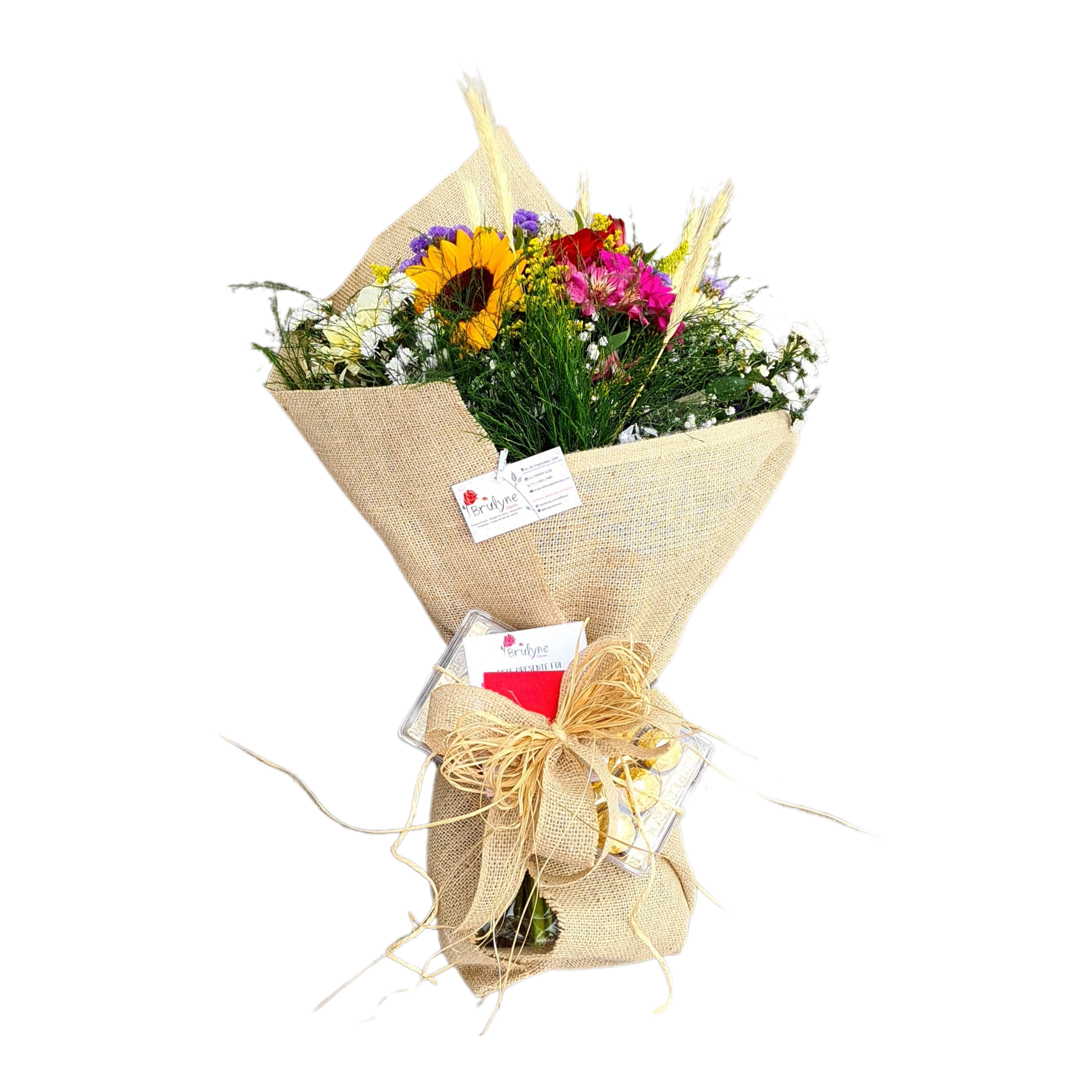 Flores coloridas de época 30 galhos variados, embalagem rústica e Ferrero Rocher ou Rafaello