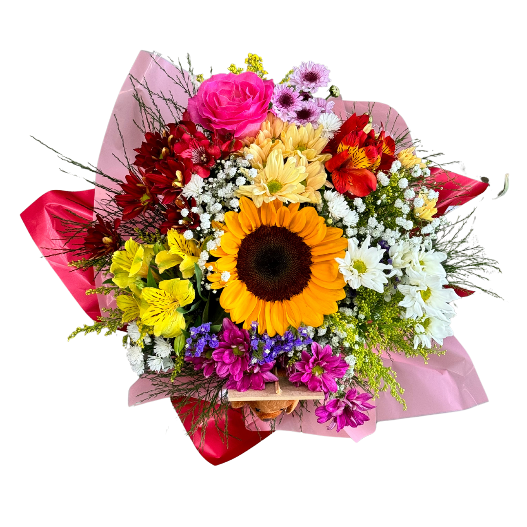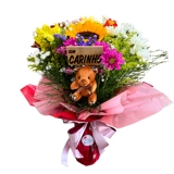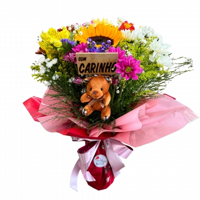 Buquê montado com flores variadas de época, no vaso de vidro com plaquinha e ursinho de pelúcia.