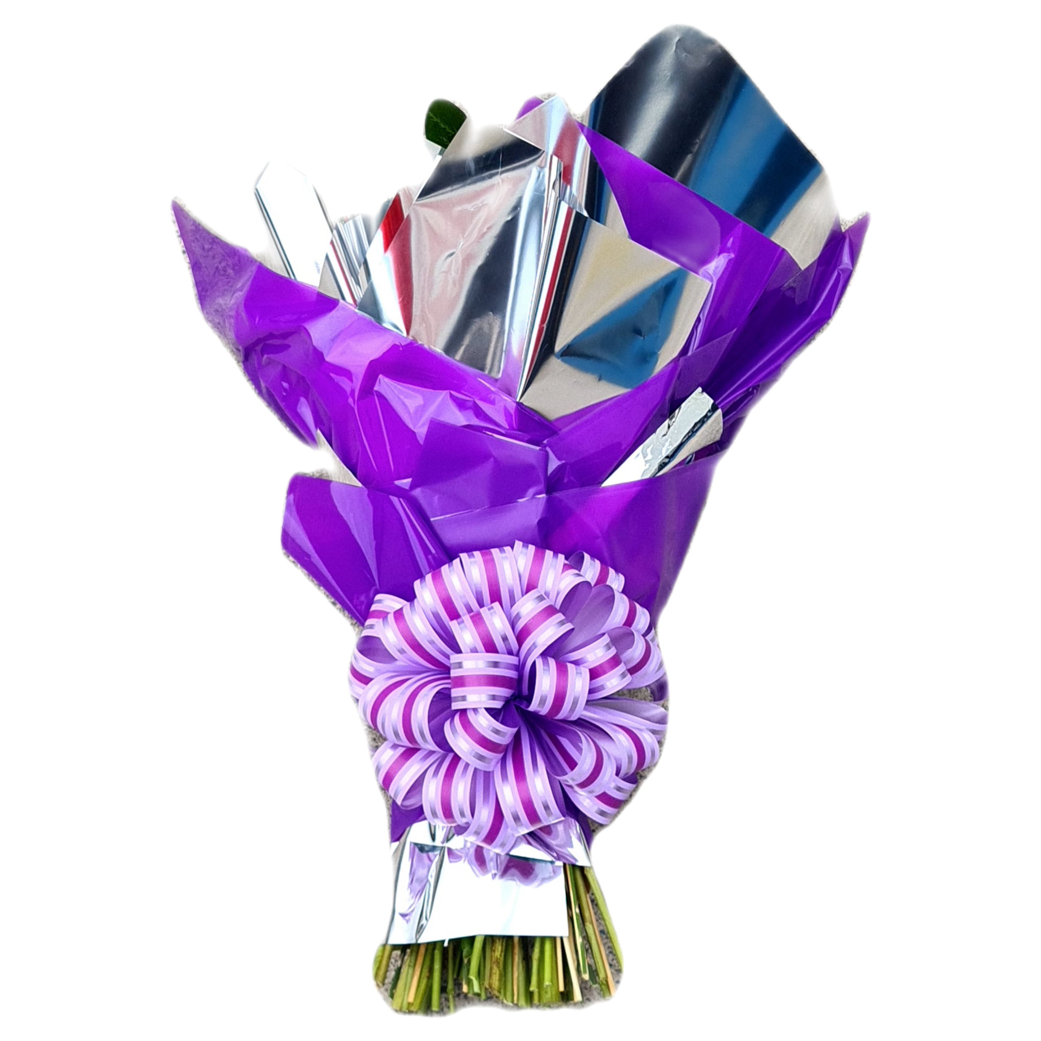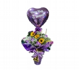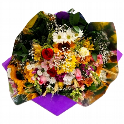 Buquê tradicional montado com flores variadas da época, bem colorido. Embalagem de celofane e laço combinando.